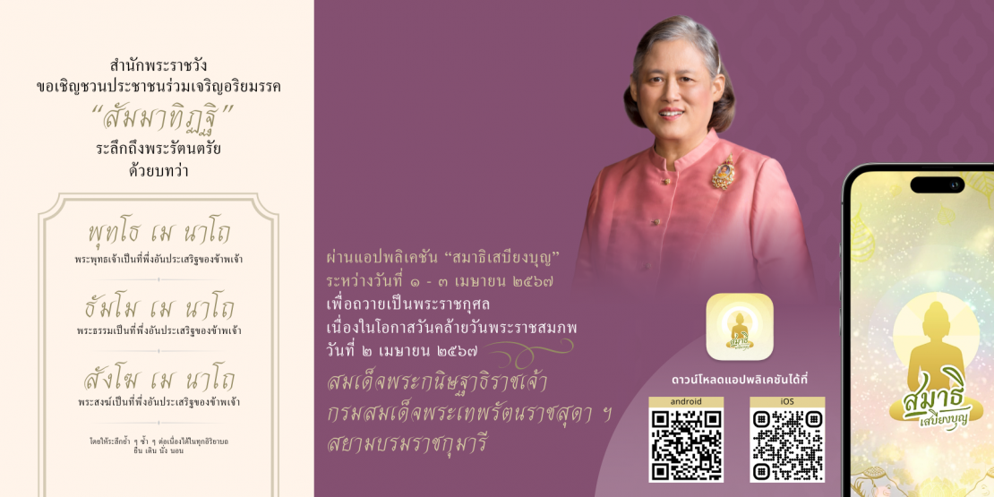 สำนักพระราชวัง ขอเชิญชวนประชาชนร่วมลงนามถวายพระพร สมเด็จพระกนิษฐาธิราชเจ้า กรมสมเด็จพระเทพรัตนราชสุดา เจ้าฟ้ามหาจักรีสิรินธร มหาวชิราลงกรณวรราชภักดี สิริกิจการิณีพีรยพัฒน รัฐสีมาคุณากรปิยชาติ สยามบรมราชกุมารี เนื่องในโอกาสวันคล้ายวันพระราชสมภพ วันที่ ๒ เมษายน ๒๕๖๗ ผ่านระบบออนไลน์ ที่เว็บไซต์หน่วยราชการในพระองค์ www.royaloffice.th ระหว่างวันที่ ๑ – ๓ เมษายน ๒๕๖๗