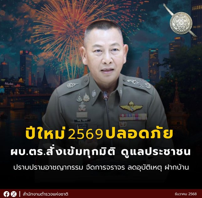 ผบ.ตร. สั่งเข้ม “ปีใหม่ 2569” ปลอดภัยทุกมิติ ปราบอาชญากรรม ดูแลการจราจร คุมเข้มจุดเสี่ยง ป้องกันเหตุร้ายทั่วประเทศ