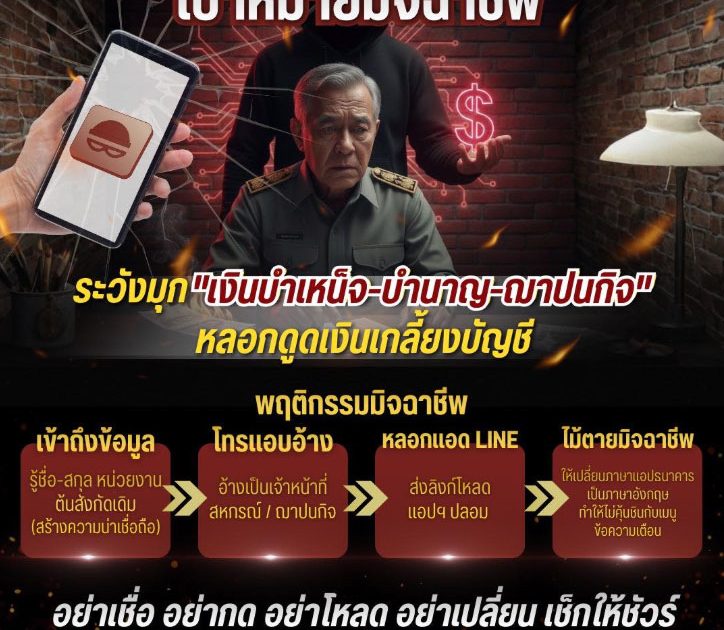 มิจฉาชีพมักแอบอ้างเป็น “เจ้าหน้าที่การเงิน” พูดคุย แอดไลน์ ส่งลิงก์ ให้อัปเดตข้อมูล ให้ทำเรื่องรับสิทธิ ฯลฯ เพื่อหลอกลวงให้โอนเงิน