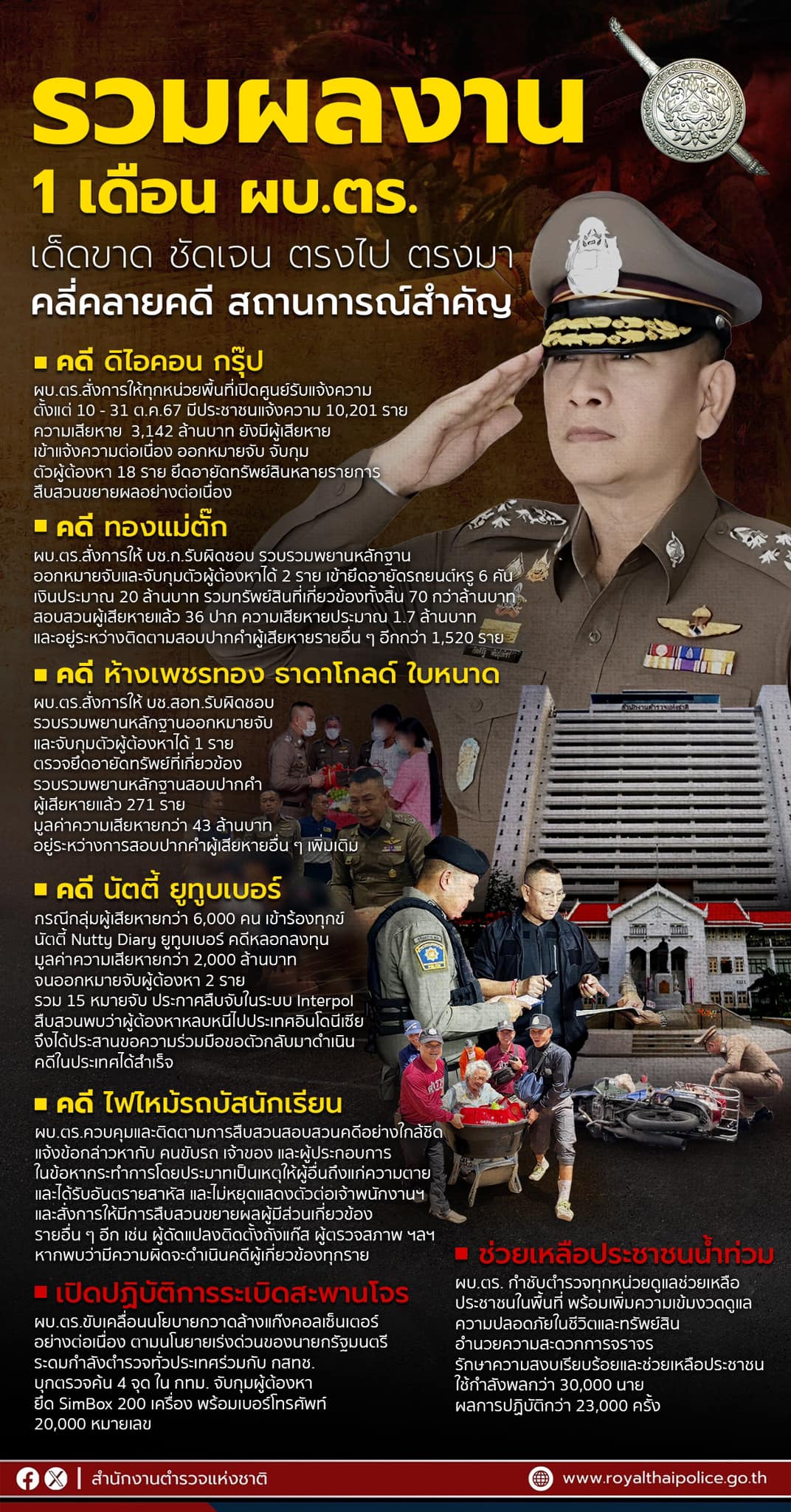 อาทิ เช่น คดีดิไอคอนกรุ๊ป คดีทองแม่ตั๊ก คดีนัตตี้ ยูทูบเบอร์ คดีไฟไหม้รถบัสนักเรียน ปฏิบัติการระเบิดสะพานโจร ช่วยเหลือพี่น้องประชาชนที่ประสบภัยน้ำท่วม ฯลฯ