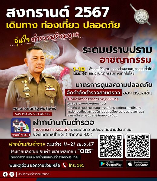 เปิด “ฝากบ้านกับตำรวจ” จัดทำ “โครงการร่วมใจ ยกระดับความปลอดภัยบ้านประชาชนช่วงเทศกาลสำคัญ ( ฝากบ้าน 4.0 )” ระหว่างวันที่ 11 – 21 เมษายน 2567 รวมระยะเวลา 11 วัน โดยให้ประชาชนเข้าร่วมโครงการผ่านแอปพลิเคชัน “OBS” หรือที่สถานีตำรวจ และให้หน่วยดำเนินการคืนบ้านที่เข้าร่วมโครงการฯ ให้เรียบร้อยภายในวันที่ 22 เมษายน 2567