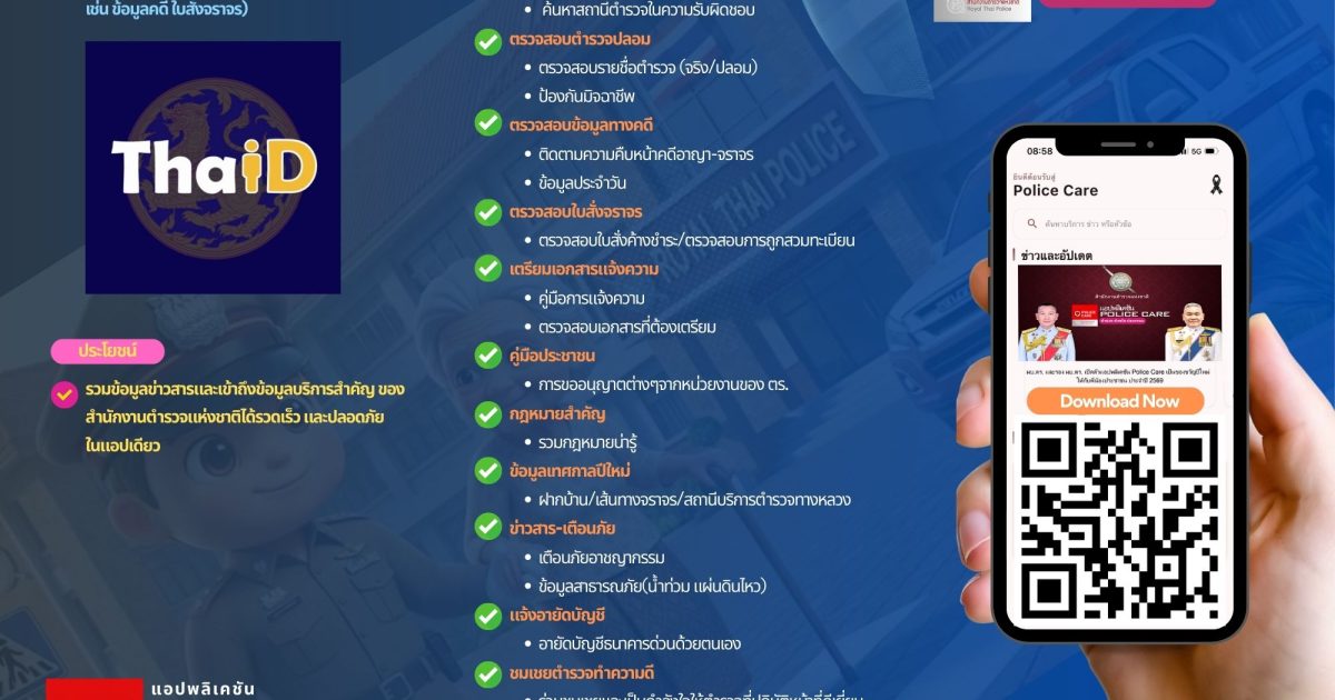 เป็นแอปพลิเคชันเพื่อบริการแก่ประชาชน รวมข้อมูลข่าวสารและเข้าถึงข้อมูลบริการสำคัญของสำนักงานตำรวจแห่งชาติได้รวดเร็ว และปลอดภัย ในแอปพลิเคชันเดียว มีฟังก์ชั่นหลากหลาย อาทิ คู่มือการแจ้งความ, ค้นหาสถานีตำรวจพื้นที่เกิดเหตุ, ตรวจสอบข้อมูลทางคดีและใบสั่งจราจร, ตรวจสอบตำรวจปลอม, กฎหมายต้องรู้, คู่มือการขออนุญาต, แจ้งอายัดบัญชี #PoliceCareApp