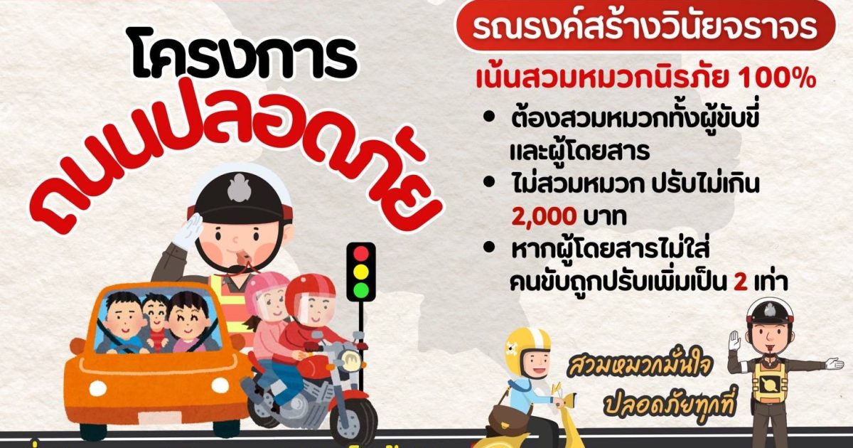 พล.ต.อ.ไกรบุญฯ สั่งการให้ดำเนินโครงการ “โครงการถนนปลอดภัย” โดยให้กองบังคับการ/ตำรวจภูธรจังหวัด ในทุกพื้นที่ พิจารณาเลือกถนนสายสำคัญในพื้นที่ หรือถนนที่มีการฝ่าฝืนกฎจราจรจำนวนมาก หรือถนนที่มีอุบัติเหตุในเส้นทางบ่อยครั้ง หรือถนนที่มีที่ตั้งของสถานศึกษาอยู่หลายแห่ง เพื่อรณรงค์ให้ผู้ใช้รถใช้ถนนต้องปฏิบัติตามกฎหมายจราจรในทุกมิติ โดยเฉพาะการสวมหมวกนิรภัยของผู้ขับขี่และผู้โดยสารรถจักรยานยนต์ต้องปฏิบัติตามกฎหมาย 100% ทั้งนี้ ตามพระราชบัญญัติจราจรทางบก มาตรา 122 กำหนดให้ผู้ขับขี่รถจักรยานยนต์ และคนโดยสารรถจักรยานยนต์ ต้องสวมหมวกนิรภัยเพื่อป้องกันอันตรายในขณะขับขี่และโดยสารรถจักรยานยนต์ หากฝ่าฝืนมีโทษปรับไม่เกิน 2,000 บาท และมีโทษปรับเป็น 2 เท่า หากผู้ขับขี่รถจักรยานยนต์ขับขี่ในขณะที่คนโดยสารรถจักรยานยนต์มิได้สวมหมวกนิรภัย โดยให้บังคับใช้กฎหมายจราจรทางบกและกฎหมายที่เกี่ยวข้องกับรถหรือการใช้ทางบนถนนดังกล่าวอย่างเข้มงวด เพื่อป้องกันการเกิดอุบัติเหตุและสร้างความปลอดภัยในการสัญจร โดยเริ่มดำเนินการตั้งแต่วันที่ 1 มิถุนายน 2568 เป็นต้นไป