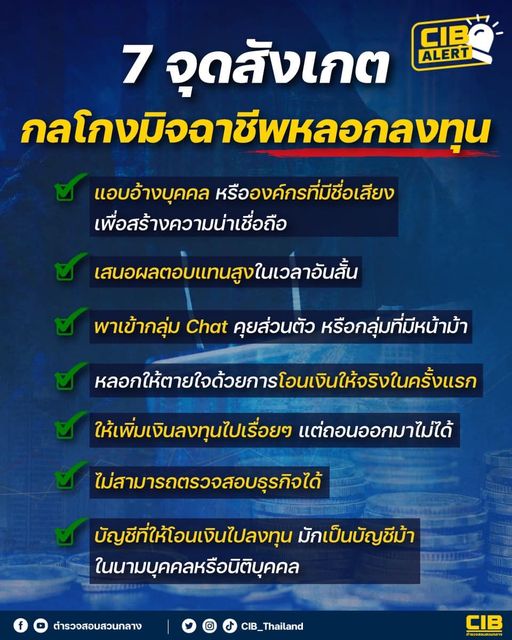 ตำรวจสอบสวนกลาง (CIB) จึงขอแนะนำ 7 จุดสังเกตกลโกงของมิจฉาชีพหลอกลงทุน ดังนี้