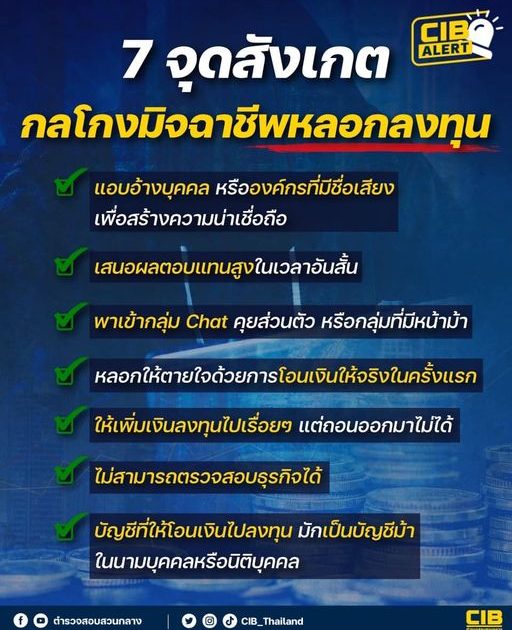 ตำรวจสอบสวนกลาง (CIB) จึงขอแนะนำ 7 จุดสังเกตกลโกงของมิจฉาชีพหลอกลงทุน ดังนี้