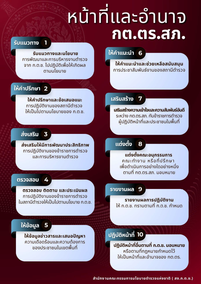 10. ปฏิบัติหน้าที่อื่นตามที่คณะกรรมการนโยบายตำรวจแห่งชาติ (ก.ต.ช.) มอบหมายหรือตามที่มีกฎหมายกำหนดไว้ให้เป็นหน้าที่และอำนาจของ กต.ตร.